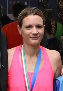 Ágnes Kovács (born 13 July 1981) is a Hungarian swimmer who competed at the 1996, 2000 and 2004 Olympics. In 2000, she won the 200 m breaststroke and set the Hungary records in the 100 m and 200 m breaststrokes events (1:07.79 and 2:24.03). As of 2014, these records still stand.[1] She won a bronze medal in the 200 m breaststroke at the 1996 Olympics and placed fifth in 2004; in 2004 she also finished fourth in the 200 m individual medley event.[2]