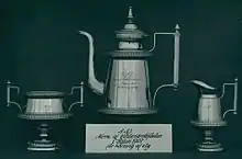 In 1907, at a winter sports festival in Falun, Stolta won a trot race against trained trotting horses over an ice-covered lake.[1][2] Jansson was afterwards presented with a coffee service: a coffee pot and accompanying sugar bowl and coffee creamer.[1][2] The coffee pot had an inscription that read Minne av Vinteridrottsfästen i Falun 1907 för körning av elg ("Memento of Winter Sports Festival in Falun in 1907 for driving with a moose").[1][2] The park where Älgen Stolta was kept closed in 1909 as the area was marked as part of the reservoir for a hydroelectric power station.[4] Stolta was moved to the open-air museum of Skansen on the island of Djurgården in Stockholm where it was thought she could be better cared for,[4] and her name was changed to "Lotta."[4] After the 1907 race, a rule prohibiting the use of moose as draft animals was added.[5] She died in Stockholm in 1925.