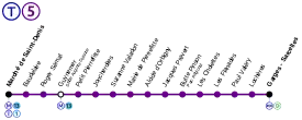 Île-de-France tramway Line 5 (usually called simply T5) is part of the modern tram network of the Île-de-France region of France. Line T5 connects the centre of Saint-Denis (Marché de Saint-Denis) and Garges - Sarcelles station, in the Northern suburbs of Paris. Line T5 was Île-de-France's first rubber-tyred tramway line. The line has a length of 6.6 km (4.1 mi) and 16 stations. It opened to the public on 29 July 2013.