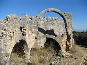 The house ruins in the north of the site are examples of the polygonal and Byzantine masonry. One house is a peristyle house. The foundations of some buildings are carved rock. There are sarcophagi along the road. At the center of the site there are ruins of a basilica. The basilica with three naves and a transept is backdated to about 500. There is a smaller church situated about 500 metres (1,600 ft) south of the basilica.[2]