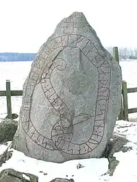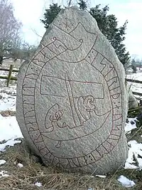 Ship images appear on several Viking Age runic inscriptions. Other runic inscriptions from the Viking Age which depict ships include DR 77 in Hjermind, DR 119 in Spentrup, DR 220 in Sønder Kirkeby, DR 258 in Bösarp, DR 271 in Tullstorp, DR 328 in Holmby, DR EM85;523 in Farsø, Ög 181 in Ledberg, Ög MÖLM1960;230 in Törnevalla, Sö 122 in Skresta, Sö 154 in Skarpåker, Sö 158 in Österberga, Sö 164 in Spånga, Sö 351 in Överjärna, Sö 352 in Linga, Vg 51 in Husaby, U 370 in Herresta, U 979 in Gamla Uppsala, U 1052 in Axlunda, U 1161 in Altuna, and Vs 17 in Råby.[1] Three stones, the Hørdum and Långtora kyrka stones and U 1001 in Rasbo, depict ships but currently do not have any runes on them and may never have had any.[1]