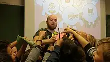 Øystein Runde (born December 14, 1979, in Ulsteinvik) is a Norwegian comics writer and comics artist.[1] Runde, Kristopher Schau and Frode Hanssen published the weekly science/humor podcast 80% from 2019 to 2020, after its end in october 2020 when Schau moved to Drammen, Runde started an english-language science podcast called Wunderdog, where he talks to "the scientists behind the ideas". Guests so far have been professor Philip Lubin who invented the concept for Stephen Hawking and Yuri Milners "Breakthrough starshot" laser, professor Robin Hanson who invented the term "The Great Filter" and wrote Age of Em about mind uploads, doctor Cynthia Phillips from NASA, staff scientist for the Europa Clipper project.