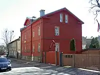 Oldest building in Āgenskalns is the Hartmann manor,[4] located in Kalnciema street 28/30. Āgenskalns is a vivid example of Art Nouveau and German Balts architectural symbiosis. One of the best examples of this is the water tower of Āgenskalns, which was projected by Wilhelm Bockslaff and built in 1910. – entrance of the water tower is decorated with various geometric ornaments that end with a triangular timpanon; other Art Nouveau features can also be seen there (stylized imperial eagle etc.).[5] In the nearby Margrietas street you can find one of Mikhail Eisenstein projected buildings, which shows a strong influence of historicism. In Āgenskalns there are many residential and commercial houses, which have been built in the 19th and 20th century, where you can find the influence of Art Nouveau. One of the most prominent Art Nouveau complexes is the Market of Āgenskalns, which was built after a project of Reinhold Schmaeling,[6] current Market building was built from 1911 until 1924. Pauls Stradiņš Clinical University Hospital was also built after one of his project and is located in Āgenskalns, Pilsoņu Street 13. Other mentionable Art Nouveau features can be found in Arcadia Park (Latvian: Arkādijas parks), made after a project of Georg Kuphaldt in 1910.