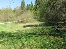 During the Second World War, an American B-24 Liberator bomber named Double Trouble crashed in Kotlice, a wooded area north of Čevica, near the base of Sleme Hill (elevation: 578 meters or 1,896 feet) on February 24, 1944. The bomber had been on a mission to bomb factories in Regensburg, but the aircraft was attacked by German fighter planes en route and caught fire. Five crew members bailed out and survived, and were taken prisoner. The remainder of the crew—four gunners and the pilot, Edwin H. Pries (1918–1944)—were killed in the initial attack and crash. The remains of the bomber and the bodies of its crew were looted by locals, and the dead were buried in Dolenji Logatec. Their remains were initially reinterred in Belgrade in 1946, and then in Italy and the United States in 1949. A memorial was installed at the crash site in 2014.[8][9][10]