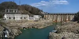 Built in 1924, the Ōi Dam was the first dam built anywhere on the Kiso River system. It is also the first hydroelectric dam built in Japan. At 53.4 m (175.2 ft) tall, it is the largest gravity dam in Japan after the Taishakugawa Dam in Hiroshima Prefecture. In 1983, the New Ōi Dam (新大井ダム Shin-Ōi Damu) was built just downstream. Combined, they produce 80,000 kW of power.