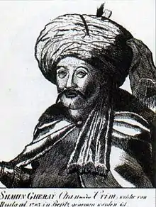 Sahin's westernization policies led to rebellion in 1777. He was only able to resume control in 1778 thanks to the assistance of Catherine II and the Russian military.[6] This turmoil turned into full civil war that led to Sahin's dethronement by the Russia's Catherine the Great in 1783.[7] Eventually, under enormous pressure from Russia and facing the inevitability of defeat, he agreed to a Russian offer to incorporate the Khanate into the Russian Empire.[8] As a result, he was compelled to move to Saint Petersburg, where he lived under house arrest. He appealed to be allowed to move to Edirne, where he had spent much of his childhood. In 1787, Russia and the Ottoman Empire agreed to allow him to move to Edirne. This move was not the retirement he was expecting because the Ottoman authorities saw him as a possible challenger to the imperial Ottoman throne. He was moved under arrest to Constantinople and then Rhodes where he was executed later that year under the order of the Ottoman sultan Abdul Hamid I.