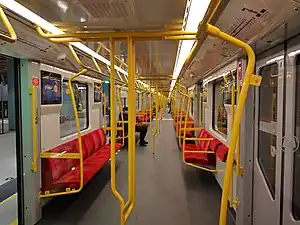 The cars are made from aluminium. A six-car long set includes 230 seats, including 2 disability seats, and can carry 1,500 passengers. Each car has 41 seats, except the car with driver's cabin, which has 33 seats.[9]