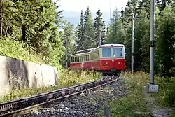 The Štrbské Pleso–Štrba rack railway is a 1,000 mm (3 ft 3+3⁄8 in) gauge narrow-gauge railway in the High Tatras. It was built in 1896 and reconstructed in 1970. At the valley terminus (Štrba railway station), it connects to the standard-gauge main line between Bratislava and Košice, and at the mountain terminus (Štrbské Pleso railway station), it connects to the Tatra Electric Railway.
