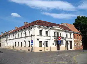 In 1912, the society purchased premises near the Town Hall and the Kaunas Priest Seminary (present-day Rotušės a. 23).[20] Most of its publications were published at the printing press of Saliamonas Banaitis which was located at the same building. The society purchased this press in 1918 and renamed it Šviesa (light). The society established a book shop at its headquarters in 1913. Later, smaller book shops were opened in Vilnius (1918), Šiauliai (1919), Telšiai, Ukmergė (1921), Tauragė, Radviliškis (1922), Panevėžys, Mažeikiai (1923), Laisvės alėja, Kaunas (1925), Vilkaviškis (1931), and Plungė (1932).[20] It also had a candle workshop which produces candles for churches and distributed goods of foreign manufacturers such as microscopes by Ernst Leitz GmbH, typewriters by the Underwood Typewriter Company, radios by Radio H. Mende GmbH.[21]