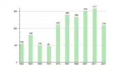 The population of Žerkščiai has remained roughly the same throughout the past 100 years, with its peak being in 2011 with 317 inhabitants[1] and its lowest being 95 in 1970.[2] Between 1979[3] and 1989,[4] the population grew more due the neighbouring city of Venta opening up a lime and later a brick factory creating more job opportunities.
