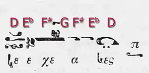 - ↑ According to this simplification a phthora of nenano is placed on δι, which in Western terms corresponds to the tone "G" (sol), then it indicates a chromatic tetrachord, approximated by the notes: D-high E flat-high F sharp-G. This is similar to the upper part of a G minor harmonic scale, or of the "Zigeunermoll" (gipsy-minor) scale. In other words, nenano is the prototype of the scale structure that includes an augmented second—which Hieronymus and Chrysanthos call more precise "trihemitone"—between two minor seconds and that is nowadays one of the most well known clichés commonly associated with near eastern or middle eastern "oriental" musical color.