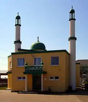 | 26. | Bait-ul-Hadi Mosque | Seligenstadt | Hesse | 2011 | "House of the Guide“, foundation 8 Apr 2011, completed 19 Jun 2011, plot 1574 m2, prayer hall 313 m2, one minaret 13 m height, 200 capacity for 150 members, €300,000,[25] Mosque was built in 3 months using module based manufacturing.[26] 50°3′18.1″N 8°57′48.3″E / 50.055028°N 8.963417°E[M 28] | ![]() |