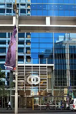 The first major office tenancy was achieved in March 2007 when Inpex signed a 10-year lease of 7,000 square metres (75,000 sq ft) of space across the building's top four floors.[19] This was followed by the National Australia Bank which took 8,900 square metres (96,000 sq ft) of space in the tower and became its anchor tenant, to enable it to shift from its current location in St Martins Centre.[20] The bank also leased 2,000 square metres (22,000 sq ft) of retail space over two levels to open a new retail headquarters fronting St Georges Terrace, and secured signage rights to the building.[20] APA Corporation is also a tenant.[21] Closer to the building's completion, NOPSA leased 1,240 square metres (13,300 sq ft) of space,[22] and engineering company KBR and subsidiary Geanherne took 5,295 square metres (56,990 sq ft) of space in the building, bringing it to 97% leased.[16] The remaining 3% of available space was leased by Microsoft shortly after completion, relocating from QV.1.