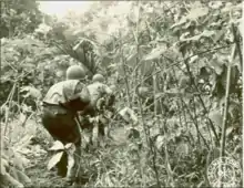 When called into service for World War II, the 103rd became part of the 43rd Infantry Division, the "Winged Victory" Division.[4] After finishing training at Camp Shelby, Mississippi, they were sent to the Pacific Theater to fight against the Empire of Japan. They embarked for New Zealand on 1 October 1942, and arrived at Auckland three weeks later.[5] The first combat operations undertaken by the regiment were in early 1943 on Guadalcanal. The Japanese had ended all organized resistance but mopping up operations were conducted to root out stubborn stragglers. The first major action the 103rd Infantry took part in began on 22 June 1943 in the New Georgia Campaign. The New England infantrymen did battle with the Japanese and the jungle alike, and many men fell to disease. Here, the soldiers "were soon introduced to the harsh realities of jungle warfare".[6] The battle was tough for the new regiment and they became bogged down in the dense jungle by the savage fighting against the enemy. The 43rd Division made a westward advance against the Japanese airfield at Munda and covered the southern (coastal) flank of the drive. The Battle of Munda Point was extremely bloody for the regiment; progress was slow and casualties were high, but eventually the area was captured on 5 August 1943, effectively ending all organized Japanese resistance on the island.[7] The 103rd saw extensive and bloody combat at New Georgia and was sent to New Guinea to act as a reserve unit during the New Guinea Campaign, where it saw minor action as a supporting element.[8]