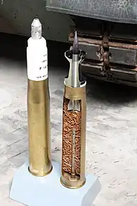 ![]() A 105 mm DM16 illuminating round alongside a 105 mm DM23 APFSDS round (cross-sectioned). | |
