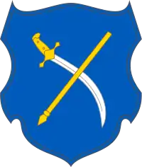 Emblem shows a crossed silver spear with a sabre. This image was used as a seal for Kalmius Palanka, a territorial district within the organization of the Zaporozhian Host the Lower, current territory of Donetsk Oblast.[6]