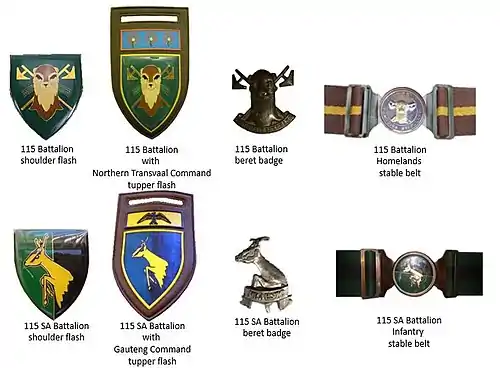 115 Battalion's badge was initially designed for its role in the KwaNdebele Defence Force. The axes and otter are symbols of the Ndebele people. The redesigned 115 SAI Battalion badge however removed any direct connotation to the Ndebele tribe and was opened up as a multi-ethnic unit while the South African Infantry colours was introduced.