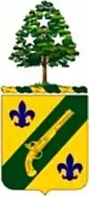 Blazon Shield: Or, on a bend sinister Vert between two fleurs-de-lis Azure, a pistol, muzzle upward, of the first. Crest: That for the regiments and separate battalions of the Tennessee Army National Guard: From a wreath Or and Vert, upon a mount of the second a hickory tree Proper charged with three mullets one and two Argent. Symbolism Shield: Yellow and green are the colors traditionally associated with Military Police units. The bend sinister signifies security. The fleurs-de-lis represent the Battalion's campaign credit during World War I and World War II. Blue indicates the unit's past affiliation in the Infantry branch. The pistol illustrates the mission of Military Police. Crest: The crest is that of the Tennessee Army National Guard. Background: The coat of arms was approved on 7 May 2009.