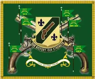 • Symbolism: Yellow and green are the colors traditionally associated with Military Police units. The bend sinister signifies security. The fleurs-de-lis represent the Battalion's campaign credit during World War I and World War II. Blue indicates the unit's past affiliation in the Infantry branch. The pistol illustrates the mission of Military Police.