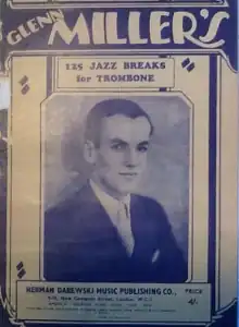 The songbook was copyrighted in 1927 as Glenn Miller's 125 Jazz Breaks for Trombone by the Melrose Brothers Music Company: The House That Blues Built, 177 North State Street, Chicago, Illinois. The score was published in the UK in London by Herman Darewski Music Publishing Co., in 1941, established by the Polish-born composer and conductor.[1] The songbook was softcover and measured 6 3/4 X 10 inches. It consisted of 22 pages. Glenn Miller is pictured on the cover in a black and white photograph. The cover illustration is signed with the initials N.E.K. The rear cover has ads for other Melrose Brothers Music Company publications including ones for Dixieland, Book of Blues, Benny Goodman, Louis Armstrong, and Jelly Roll Morton.