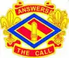 • Description: a gold color metal and enamel device consisting of a scarlet diamond, long axis horizontal, bearing throughout a gold diagonal stripe from upper left to lower right, and charged overall with a gold artillery projectile extending vertically from base, all within a blue border and all in front of a gold fleur-de-lis on the left; at the top, on a scarlet arched scroll tangent to the peak of the diamond and between the central lobes of the fleurs-de-lis, the inscription “Answers,” and in reverse arch in base, a scarlet scroll with ends folded in back of the fleurs-de-lis inscribed “the Call,” all letters gold. The central areas between the scrolls and diamond are pierced.
