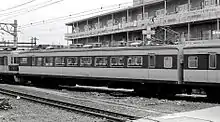 The 157 series fleet included a dedicated imperial train car, built by Kawasaki Sharyo (present-day Kawasaki Heavy Industries) and delivered in June 1960.[4] Numbered KuRo 157-1, the car could be inserted into 157 series formations for use on imperial train workings.[5] One end had a gangwayed driving cab based on the 153 series EMU design, although the car was normally sandwiched in the middle of a 157 series formation, and was only very rarely used with the driving cab leading.[4] In 1979, the car was modified for use in conjunction with 183 series EMUs, with the first official working on 2 July 1980.[4] From March 1985, it was repainted in cream with a green stripe for use in conjunction with 185 series EMUs.[4]