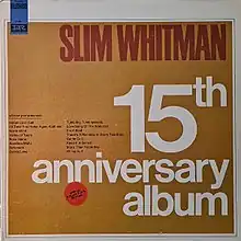 - ↑ "Slim Whitman – 15th Anniversary Album (1967, Gatefold, Vinyl)". Discogs. Retrieved 2023-02-08.