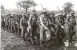 In October 1944, after 16 months active service, the brigade returned to Australia for rest and reorganisation on the Atherton Tablelands in Queensland.[40] By that time it had grown to a full brigade-group, consisting of a headquarters, three infantry battalions—the 24th, 57th/60th and 58th/59th Battalions—and supporting elements including a signals section, a flamethrower platoon, three troops of tanks from the 2/4th Armoured Regiment, a section of engineers from the 15th Field Company, a company from the 1st New Guinea Infantry Battalion, the 266th Light Aid Detachment, as well as military police, postal and dental units and a detachment from the Australian New Guinea Administrative Unit.[41] Also in support was artillery from 5 Battery, 2nd Field Regiment and four 155 mm guns of 'U' Heavy Battery.[41][42]