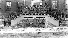 The Northern Pioneers, or the "23rd Regiment, The Northern Fusiliers" was formed on September 1, 1903.[1] The Department of Militia and Defence authorized the formation in 1903 in order to fill the geographical gap between the 35th Simcoe Foresters in Huntsville and the 97th Algonquin Rifles in Sudbury. The Northern Pioneers headquarters in Parry Sound, embraced Muskoka-Parry Sound and as far north as North Bay.[2] To cover the vast territory the regiment was sub-divided into various companies. Parry Sound, geographically speaking, was not an idealistic military district. Other regiments in more urban centres drilled in armouries throughout the year, the Northern Pioneers would get together in summer months for two-week training periods in regular army bases such as Niagara–on-the-Lake. To get to Parry Sound for the summer camp of 1912, the company from Loring had to travel west for 48 km on a wagon road through the bush to catch a CNR train at Salines (later called Drocourt).[3]