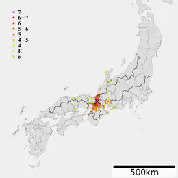The 1662 Kanbun earthquake (Japanese: 寛文地震) affected Japan on June 16, 1662. The magnitude was M7.6.[2] Strong shaking were felt over a wide area, mainly in the Northern Kinki region (Around Lake Biwa), and damage was particularly severe in Ōmi and Wakasa.[3][4] There was also great damage in Kyoto.[5] The earthquake killed 700–900 people and destroyed 4000–4800 houses.[6][7] This earthquake caused crustal deformation; east of Lake Suigetsu land rose 4.5 m (15 ft)).[8]