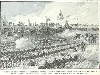 The regiment was in action at West Point, and at Gaines Mill, its loss being over 200 killed and wounded. Their straw hats stood out on the battlefield, making them targets for Confederate guns.[1] The regiment was present through the remainder of that week of battle, but was not closely engaged, then encamped at Harrison's Landing until August 16, 1862, when it returned for a brief period to Alexandria. In the Battle of Crampton's Gap it was in the van and lost heavily and was held in reserve at Antietam; at Fredericksburg was posted on picket duty, and after the battle went into winter quarters near Falmouth. It shared the hardships and discomforts of the Mud March under Burnside and was active in the Battle of Chancellorsville, with a loss at Salem Church of 20 killed, 87 wounded and 49 missing. A few days were next spent at Banks' Ford, then a short time in the old camp at Falmouth, and on May 22, 1863, the regiment was mustered out at Albany. During its term of service, its loss was 112 men killed or mortally wounded and 84 deaths from other causes. The three years men were transferred to the 121st New York.