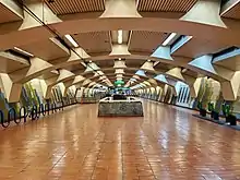 16th Street Mission station has two escalator and stair banks at the northeast and southwest corners of the intersection, which lead to a mezzanine under the intersection. A single row of faregates connects to a vaulted paid mezzanine centered over the platform area.[4] The station has a single island platform serving two tracks. 24th Street Mission station has an identical design.[5] Both stations have concrete reliefs by William Mitchell on the walls of their entrances, as well as colorful tilework on the mezzanine and platform levels.[6]