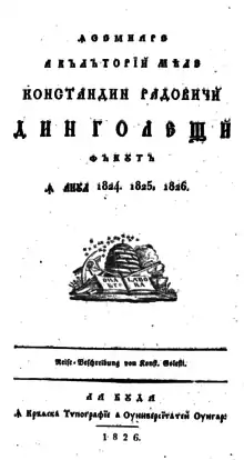 - May 18 – At Buda, Habsburg Hungary, Wallachian intellectual Dinicu Golescu receives imprimatur for his Însemnare a călătoriei mele (Accounts of My Travels).[16] This pioneering travelog covers extensive trips in Central and Western Europe, which Golescu had begun in 1824. The author documents his own "amazed 'discovery' of the West [and] acceptance of his country's admitted inferiority."[17] As a "manifesto for the new culture" Însemnare promotes Wallachia's passage into the Age of Enlightenment. For the same purpose Golescu sponsors a school on his estate.[18]