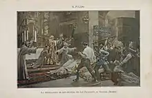 The massacre of friars in Madrid in 1834 was an anti-clerical riot that took place on July 17, 1834, in the capital of Spain during the regency of Maria Cristina and the first Carlist war (1833-1840) in which several convents in the center of Madrid were assaulted and 73 friars were killed and 11 were wounded, because of the rumor that spread through the city that the cholera epidemic that had been ravaging the city since the end of June and that had worsened on July 15 had occurred because "the water in the public fountains had been poisoned by the friars".[1] "The result of little more than twelve hours of violence" was a "party of blood and vengeance".[2] "It was the first time that the Church had been subjected to the uncontrolled actions of its own believers. As contemporaries observed, these events demonstrated, above all, the loss of prestige of the religious in Catholic Spain, as was happening in other countries".[3]