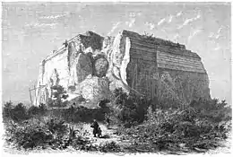 The mainshock was preceded by a large foreshock in 1838 which also damaged the capital.[11] Great damage was reported in Inwa, so severe that the formal capital was moved to nearby Amarapura. In Mingun, a stupa sustained serious damage as a result of shaking. British officials in Myanmar recorded catastrophic damage and liquefaction in Mandalay and the surrounding area.[12][13] Many pagodas collapsed during the event. Chasms and fissures more than 10 ft (3.0 m) wide were seen in Amarapura and nearly every brick building was reduced to rubble. Some villages were swallowed up as a result of liquefaction.[13] By a contemporary British estimate 300–400 people were killed.[2] The shock also reversed the flow of the Irrawaddy River, where the currents became violent and overflowed its banks.[12] It was felt for thousands of miles away from the epicenter, as far as Dacca, Calcutta and Bangkok.[3]