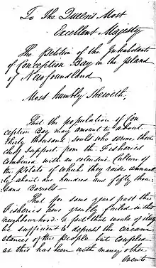 When harbors re-opened in the spring of 1847, the traditional seal hunt began with thousands of Newfoundlanders sailing to the ice fields, laboring under an acute shortage of provisions. Much as in the previous spring, many found no seals and returned to shore, several months later, "without a morsel of food or a penny in their pockets."[16] This second unsuccessful seal hunt was followed by a summer cod fishery that was also as dismal as the previous year's. With the failure of its fisheries for the second consecutive year, the inhabitants of Newfoundland fell into the same precarious position as those in Ireland, dependent for sustenance on a single agricultural crop.[17][18]
