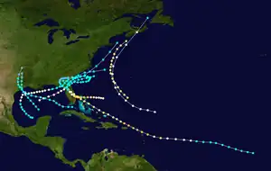 On August 17, the fourth tropical storm of the season developed 550 mi (885 km) west-southwest of the Cape Verde islands. The system progressed on a west-northwest track and steadily intensified, becoming a major hurricane at 00:00 UTC on August 21. Bearing peak winds of 115 mph (185 km/h), the hurricane passed over Antigua, Sint Eustatius, Saint Kitts, and Saint Thomas. Continuing northwestward, it passed 30 mi (50 km) northeast of Fajardo, Puerto Rico.[16] The hurricane then weakened to a Category 2 hurricane, maintaining this strength while making further landfalls in the Bahamas. At 05:00 UTC on August 25, the storm struck near present-day Vero Beach, Florida, with winds of 105 mph (165 km/h).[17] After crossing Central Florida, it entered the Gulf of Mexico and made a final landfall on Taylor County, Florida, as a tropical storm. The storm then moved north and east over land, weakening into a tropical depression, before strengthening back into a tropical storm after re-emerging into the Atlantic off South Carolina. At 12:00 UTC on August 30, the cyclone reattained winds of 70 mph (110 km/h). The storm was last sighted 90 mi (145 km) east of Cape Cod.[6]