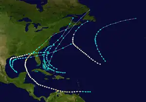 A Category 1 hurricane was first discovered on September 16 in the mid-North Atlantic. It moved generally to the northwest for a few days then passed safely to the northeast of Bermuda between September 18 and 19th. It weakened to a tropical storm as it was moving toward Atlantic Canada. It dissipated while just offshore of southern Newfoundland.[2] The storm is known to have reached hurricane strength from ship reports, most notably from the Harley John, and wind reports from St. Paul Island, Canada[4]