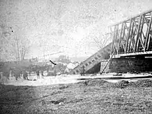 On January 15, 1878, around 10:00 PM,[1] a passenger train returning from Hartford crossed the wooden bridge spanning the Farmington River at Tariffville, as one of the two main bridge spans collapsed, dropping two locomotives, one baggage car and three passenger coaches into the icy river. Some people from New Hartford hitching a ride between the cars were killed when they were thrown beneath the wreck.[3] The wreck claimed 13 lives and injured more than 70, some severely.[2] Many of the passengers were returning from a Protestant revival meeting in Hartford featuring well-known evangelist Dwight L. Moody.[3]