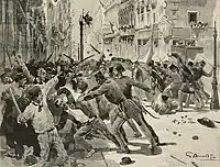 - August 23 – Start of a three day popular revolt in Naples incited by horse-cab drivers notoriously linked to the Camorra, who called for a strike against the agreement between the city administration and the Belgian tram company Société Anonyme des Tramways Provinciaux (it), which provides for the extension of the tramway line to other parts of the city.[9] The coachmen created riots and wreak havoc on the streets of Naples together with thousands of other demonstrators descending from the working-class neighbourhoods. Carriages that did not participate in the strike were attacked and a tram was burnt down. The police fired on the demonstrators, injuring some of them and killing a boy. His corpse is carried in a tumultuous procession and continuous clashes with the police, from San Carlo all'Arena to the Prefecture. The riot spreads, shops are attacked, shop windows smashed. Devastations multiply, but do not result in looting.[9]