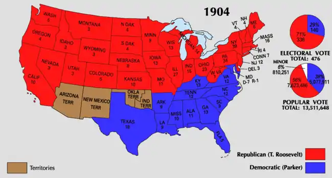 - ↑ "1904 Presidential General Election Data - National". Uselectionatlas.org. Retrieved April 26, 2013.
