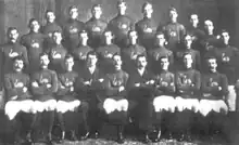 The captain of Tasmania was Bruce Carter.[25] The squad originally selected was: from the South: Roy Bailey (half back), P. Orpwood (back), Walter Burrell (following and back), L. Bridges (wing), Weller Arnold (centre), C. Ward (centre and half-back), E. RusseIl (wing), W. Lee (forward and rover), T. Abel (follower), C. Webb (follower and back), W. Forster (rover and half-forward); from the North: Algy Tynan (full back), A.J. "Barney" Badcock (half-back), W. Ride (back), B.L. Thomson (back), Charlie Searl (wing), Hastings Woolley (half-back and follower),[26]Joe Littler (forward), Viv Valentine (forward); from North-West Coast: B. Carter (centre), W. Rutter (follower), T. Mahoney (follower); from West Coast: A. Trotter (centre and forward), George McLeod (forward and follower). Emergencies: K. Appleby (North-West), first back and follower; Norman F Pannam (North West), first forward and second follower; L. Norman (North), rover and third forward; A. Tucker (South) second back and wing; B. Filgate (North-West), full back and wing.[27] During the carnival, the Tasmanian team, coached by Jack Gardiner and Dick Gibson,[28] trained at the South Melbourne Cricket Ground.[29]