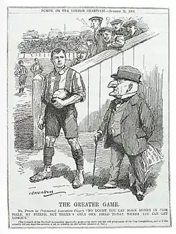 The magazine Punch was critical of the decision to allow competitive football to continue after the outbreak of war. Mr Punch is depicted saying to the footballer "No doubt you can make money in this field, my friend, but there's only one field today where you can get honour".