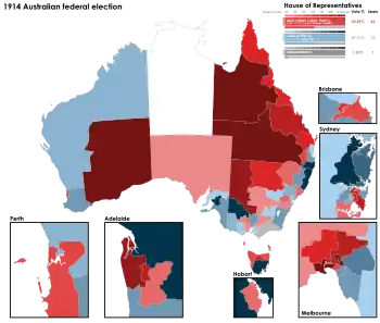 The 1914 Australian federal election was held in Australia on 5 September 1914. The election had been called before the declaration of war in August 1914. All 75 seats in the House of Representatives and all 36 seats in the Senate were up for election, as a result of the first double dissolution being granted. The incumbent Liberal Party, led by Prime Minister Joseph Cook, was defeated by the opposition Labor Party under Andrew Fisher, who returned for a third term as prime minister.