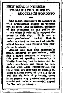 - ↑ "Torontos Out of Pro League". The Globe. February 12, 1917. p. 9.