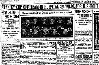 The series was a rematch of the 1917 Stanley Cup Finals and the first since the armistice to end World War I.[3] Hosting the series in Seattle was the Pacific Coast Hockey Association (PCHA) champion Seattle Metropolitans, playing against the National Hockey League (NHL) champion Montreal Canadiens. Both teams had won two games, lost two, and tied one before health officials were forced to cancel the deciding game of the series.[2] Most of the Canadiens players and their manager George Kennedy fell ill with the flu and were hospitalized, leaving only three healthy players.[1] The flu claimed the life of Canadiens defenceman Joe Hall four days later.[4] Kennedy was permanently weakened by his illness, and it led to his death in 1921.[2][5]