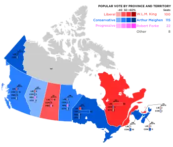 The 1925 Canadian federal election was held on October 29, 1925 to elect members of the House of Commons of Canada of the 15th Parliament of Canada.[2] The Conservative party took the most seats in the House of Commons, although not a majority. Prime Minister William Lyon Mackenzie King's Liberal Party was invited to form a minority government. Unlike the Conservative party, King's Liberals had the conditional support of the many Farmer/Progressive MPs.