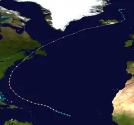 Thereafter, the storm accelerated toward Atlantic Canada. Around 18:00 UTC on August 24, the hurricane made its closest approach to the United States, passing about 60 mi (100 km) southeast of Nantucket island in Massachusetts. About five hours later, the system struck near Yarmouth, Nova Scotia, as a Category 2 hurricane with winds of 105 mph (165 km/h).[3] Based on distribution of rainfall over Nova Scotia, the storm was believed to have made landfall as a tropical cyclone.[2] By 00:00 UTC on August 25, the hurricane transitioned into an extratropical cyclone. The remnants moved quickly east-northeastward, striking Newfoundland and later Iceland, before dissipating near Jan Mayen on August 29.[3]