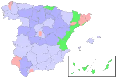 In common with the 1936 election, Spain was divided into multi-member constituencies; for example, Madrid had 17 representatives. However, each member of the electorate could vote for somewhat less than that – in Madrid's case, 13. This favoured coalitions, as in Madrid when the Socialists won 13 members and the right, with only 5,000 votes less, secured only the remaining 4.[17] This system had been passed in 1933. There would be two rounds of voting; 40% of the vote was necessary in the first round to win. In the event that no list of candidates reached 40%, then a second round would be composed of those achieving at least 8% in the first round.[18] It was the first election in Spain where women had the vote, following the new constitution.[19] This incorporated a new 6,800,000 electors.[18] The elections were held under Republican electoral law, which would guarantee a certain percentage of seats in a district to a plurality of votes no matter how weak the plurality. This law was amended in July 1933 to make it even more disproportionate (winning a plurality guaranteed 67% of seats and winning a majority guaranteed 80% of seats). This meant it strongly favoured coalitions and it had been passed by the Azaña government in the hopes it would secure electoral victory for the Spanish left.[20][21]