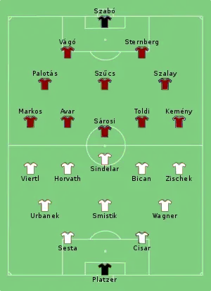 Both teams changed their usual line-ups, resting several players. Austrian players wore an unusual light blue jersey borrowed from Napoli because of the clash of colours between the two traditional jerseys. Germany took the lead inside 25 seconds with the fastest goal of the tournament, scored by Ernst Lehner. They doubled the lead with Edmund Conen, but Austria got one back immediately after with Johann Horvath. Germany's third goal came after Karl Sesta attempted to sit on the ball to ridicule a German player; the ball was stolen by Conen, who crossed to Lehner. Sesta then scored a goal, but Germany held on for the victory.[2]